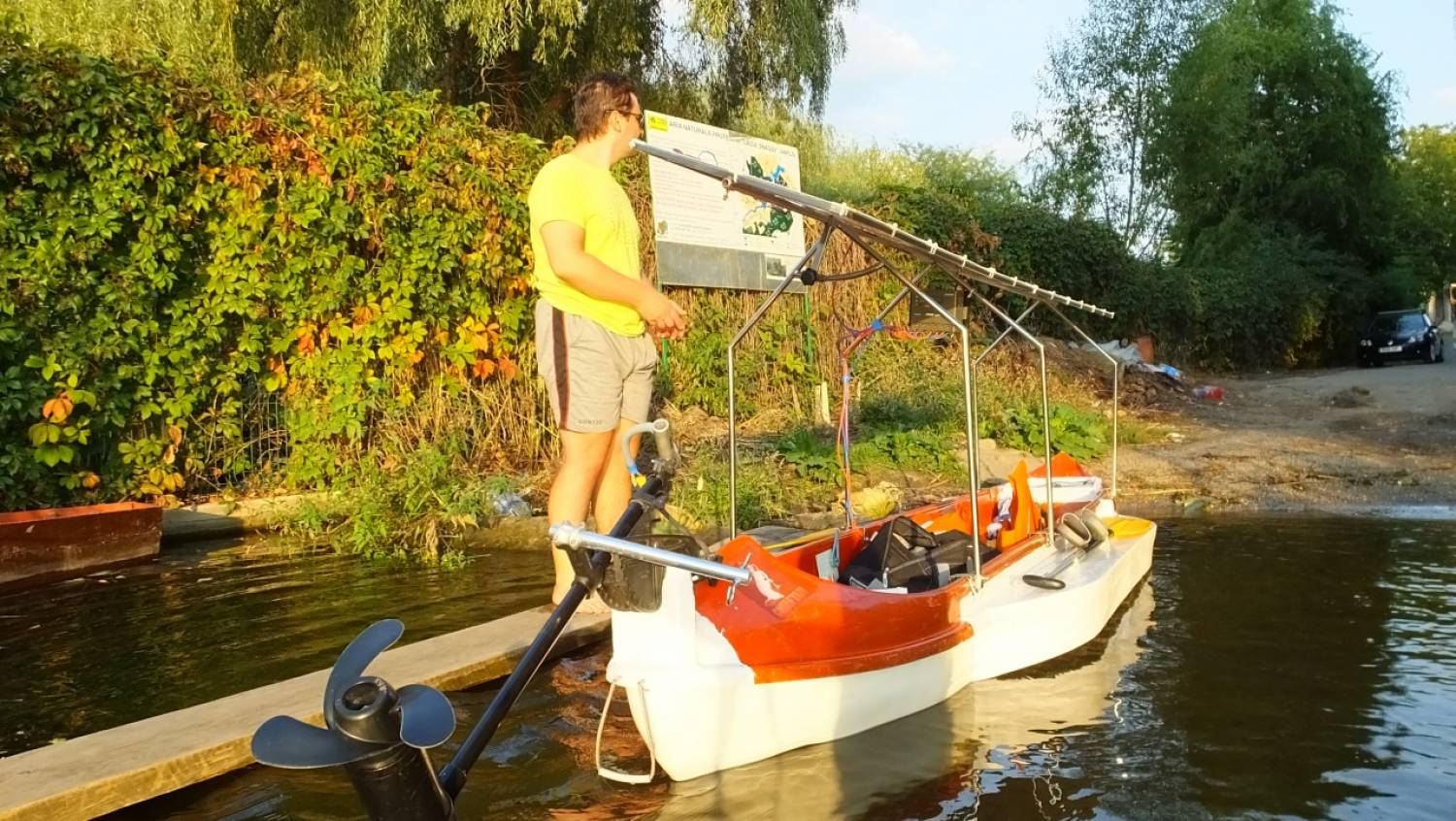 A urmat apoi un nou test prin apropierea Bucurestiului, de data asta cu panourile montate; rezultatele au fost si bune si rele, bune ca mergeau panourile si primeam destula energie de la soare, rele ca stabilitatea laterala nu prea mai e, iar la valuri sau vant moderat mai mult ca sigur ma rasturnam. Ce e de facut? Am inceput sa usurez suportul pentru panouri, si sa reduc inaltimea lor; aici am mai pierdut 1,5-2kg, barca era mai stabila insa nu suficient.