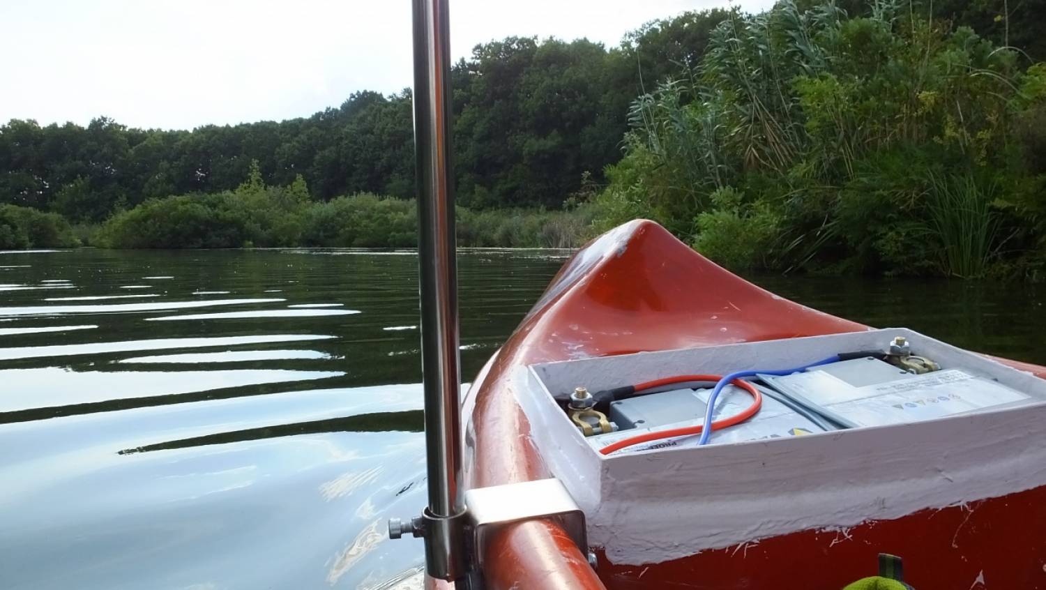 Ideea de a o converti in canoe solara o aveam demult, chiar la inceputul verii mi-au venit si panourile solare, motorul, asa ca am inceput testele. In prima faza am avut un motor electric “trolling” folosit de pescari pentru tractiune barci pe distante scurte pentru a nu deranja pestii de 62 lbs la 12V cu 300W si o baterie plumb de descarcare adanca 105Ah.